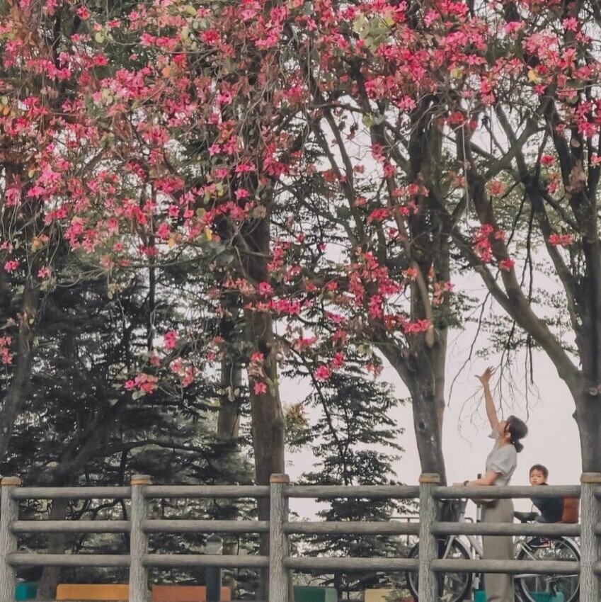二水鄉的花旗木正在盛開中,位於源泉派出所附近的鐵道旁,種植著一整排的花旗木,每年三四月花季時,粉色的花瓣隨風搖曳,騎著自行車穿過其中,每當輕風吹過便落下陣陣的花瓣雨,畫面真是美不勝收。一旁的鐵道不時會有火車經過,建議事先查好時間前來,便能捕捉到火車經過粉紅花旗木下的浪漫景色。
