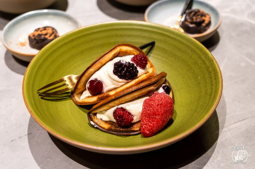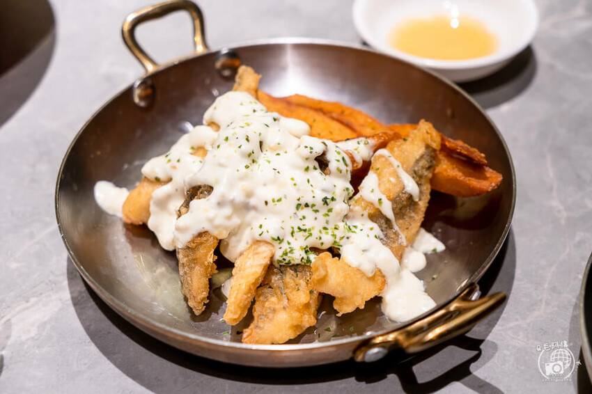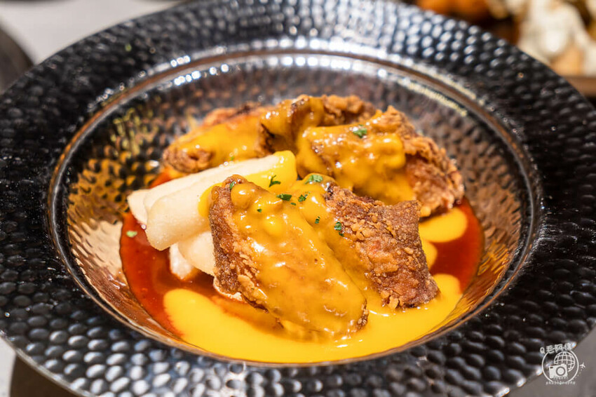 這個是加價的炸蝦馬卡龍,層次會比較豐富一點,有兩種食材有各自的醬料可以搭配,有點像是講究風味搭配的法式料理,可加價升級很OK。