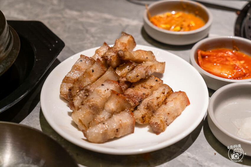 松阪豬很大一塊還有厚度,加上《紫木槿韓國烤肉》店員烤功了得,吃起來完整保留了脆度微Q的口感。