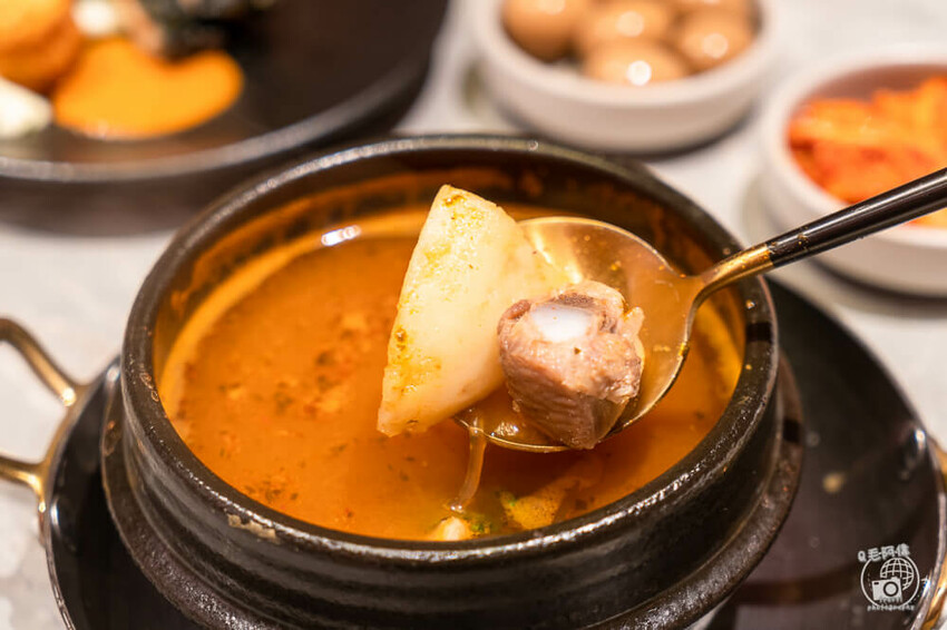 點套有副鍋物的部分,阿偉我加價點了馬鈴薯排骨,剛上桌是開心的,畢竟又能喝到一種韓式湯物,滿心期待盛了一碗,這馬鈴薯、排骨給不少啊!