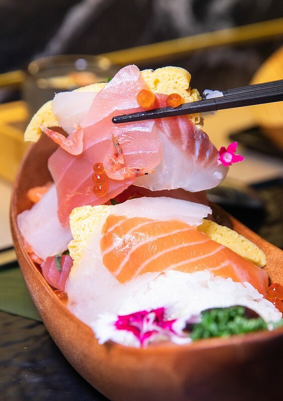 食材方面生魚片都相當新鮮,包含鱘龍魚、黑毛、鱒鮭、鯛魚、比目魚,另外還有干貝、甜蝦、櫻花蝦,底下舖著一層滿滿的醋飯。
