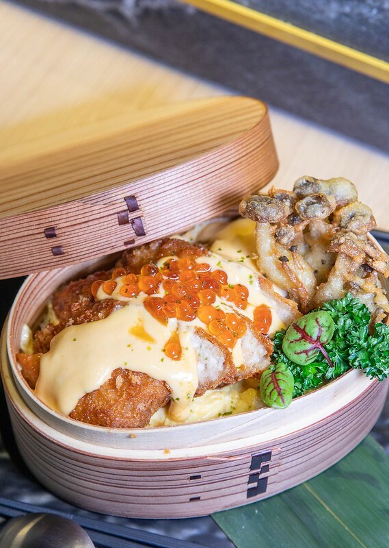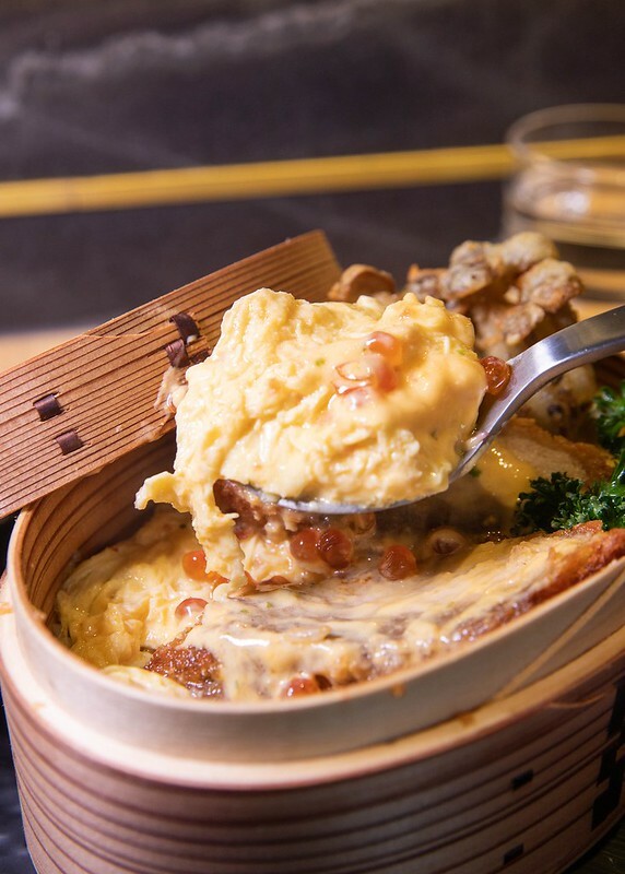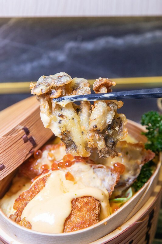 搭配同樣酥炸的舞菇,底下是像蛋包飯般的半熟蛋,佐著金棗蝦味醬油和濃滑的起司醬一起入口,那絕妙的乳化口感和底下的白飯完美的搭配,真心喜歡!