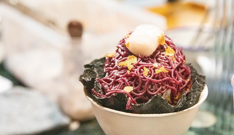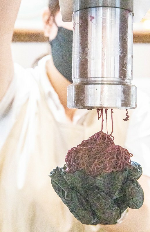 最後是人氣最高的花蓮蜜香芋頭紗織,據說這是花蓮目前唯一的紗織甜點,使用的是花蓮吉安的蜜香芋頭,現點現擠下的芋頭絲,完全有療癒的視覺效果,上面放了一點脆片和芋圓。