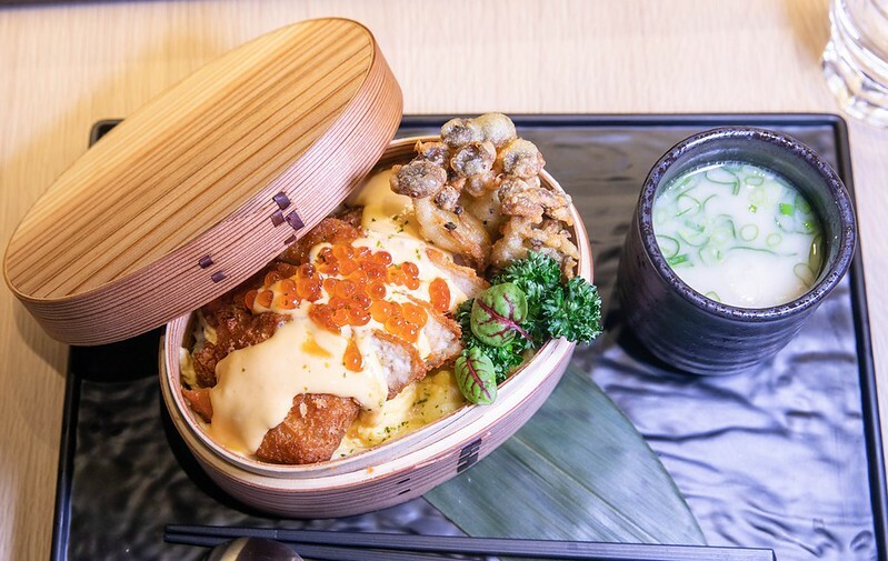 鱘魚卡茲丼,以懷舊的木片便當盒裝盛,特別吻合將軍盒的概念,底下還舖著竹葉含意著台式的組合,可愛又討喜,同樣也附有酒粕味噌湯。