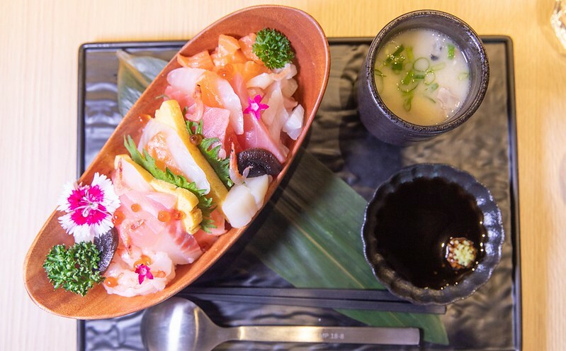 海鮮鮨味珠寶盒,滿滿的海鮮船,像是散壽司的組合又排列整齊,數種東海岸紅白魚、蝦子、鮭魚卵還附一杯加入酒粕的味噌湯,特別一是的是醬油用的是自家品牌的探索魚淬高湯醬油。
