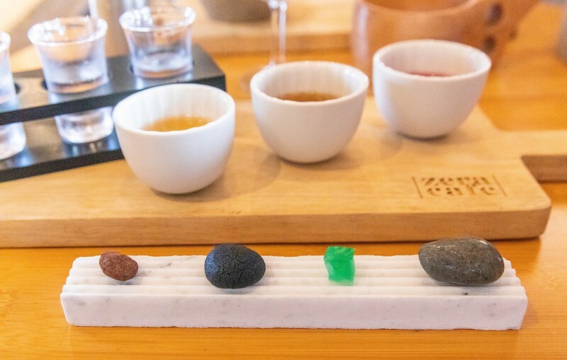 特別一提的是這裡的甜點是花蓮著名的樹里私廚甜點監製,底下是花蓮特有的卡拉拉白石材,甜點的造型構想是沾滿泥土的石塊、在花園裡的黑色石頭、被打磨成水晶的礦石、以及在海邊的鵝卵石。由右至左由像冰淇淋的百香果奶餡做清爽的交接、其次是衝突口感的玫瑰荔枝琥珀糖、接著是酥酥鬆鬆的竹炭雪球餅乾、最後是偏愛的焦糖杏仁巧克力。