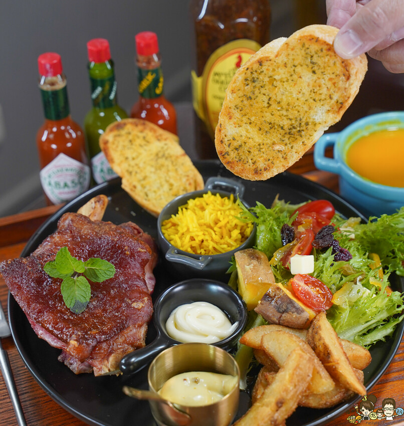餐點都會附餐,手作法國大蒜+原味法國切片、老爺爺南非風味楔型薯塊、老奶奶手作非洲風味薑黃飯、純生乳發酵蜂蜜核桃果乾優格、Gauteng J’obury 新鮮沙拉、、Gauteng 主廚玉米濃湯