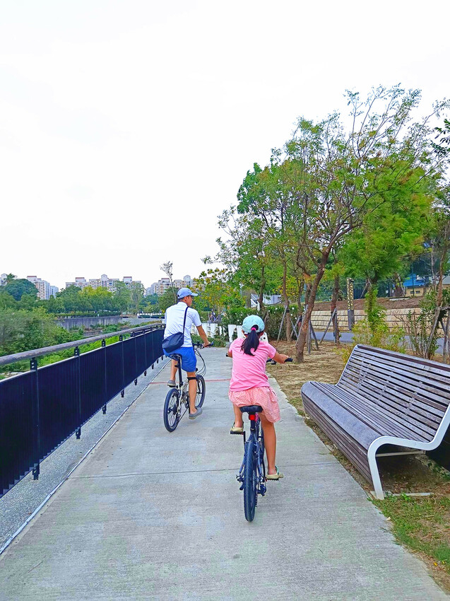 也有人在水岸公園裡悠哉地騎單車,瞧瞧父女二人騎得一派悠閒,但摩托車則禁止進入