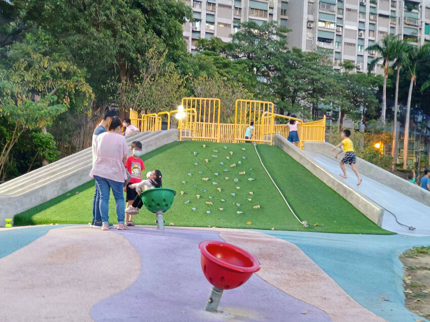 小山坡上有好幾個溜滑梯,旁邊還有類似陀螺的搖搖椅,最適合年齡幼小的兒童來玩
