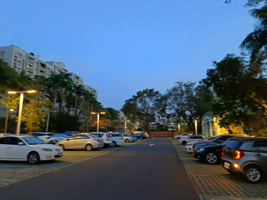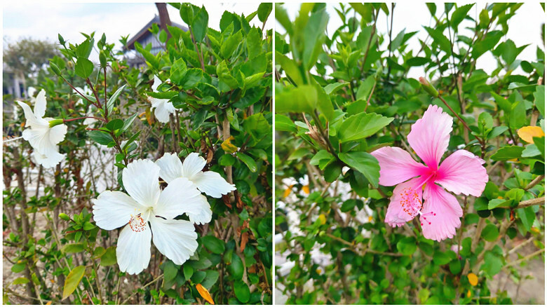 路邊的扶桑花開得正美,還有粉紅和白色的不同顏色,跟我小時看慣的大紅扶桑花,各有不同的美感