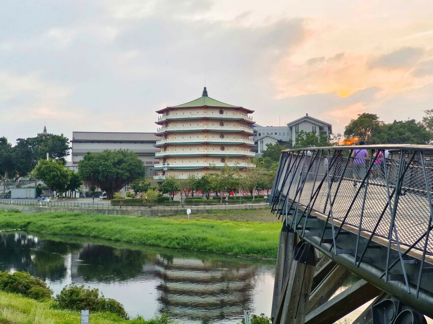走過月見橋的對面就是竹溪禪寺,七層樓的八角形建築矗立在竹溪河岸旁,剛好跟月見橋相映成趣