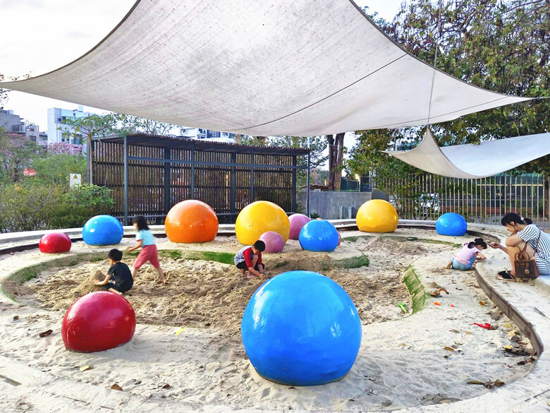 沒想到竹溪水岸公園旁還有這個兒童遊戲區,大沙坑裡有好幾個彩色圓球,似乎在為明天的活動作鋪陳