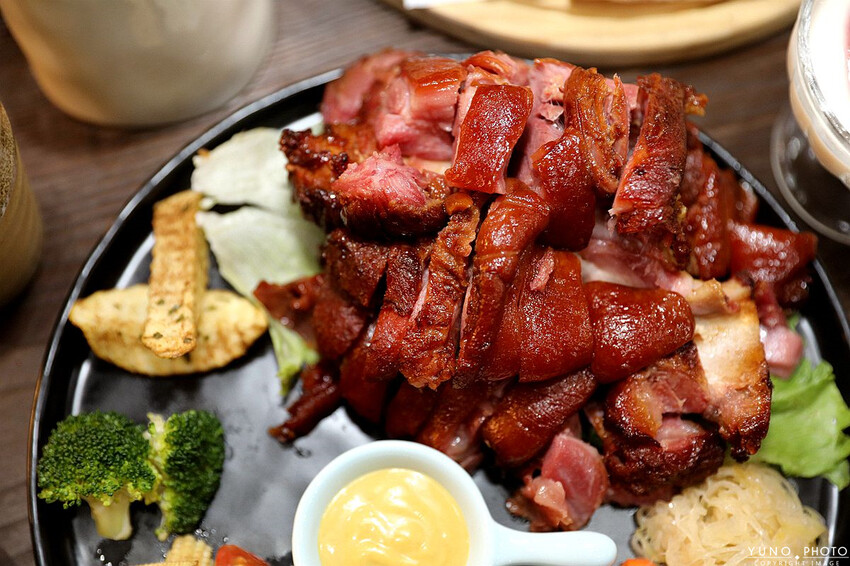烤到外皮Q彈有嚼勁 瘦而不肥的豬腳 粉紅色澤超誘人 豬腳肉嫩彈微紮實不乾柴