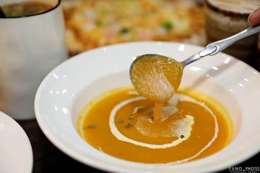 今日的主廚濃湯為南瓜濃湯 淋些鮮奶油和灑點巴西里葉