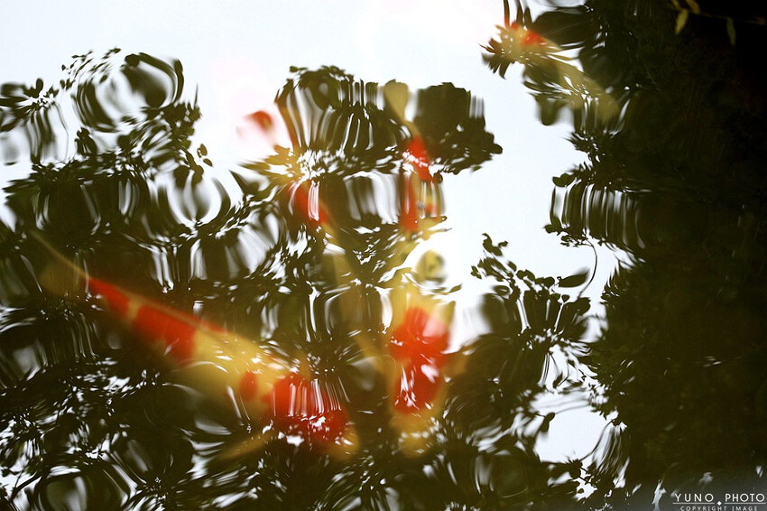 游翠綠池塘中 可以看到許多魚群在水中自由自在地悠游 尋找食物 享受陽光和水的樂趣