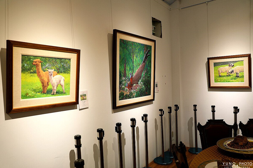 除了展示各種石頭藝術品 後方牆面上的畫作也為整個場景增添了人文氣息