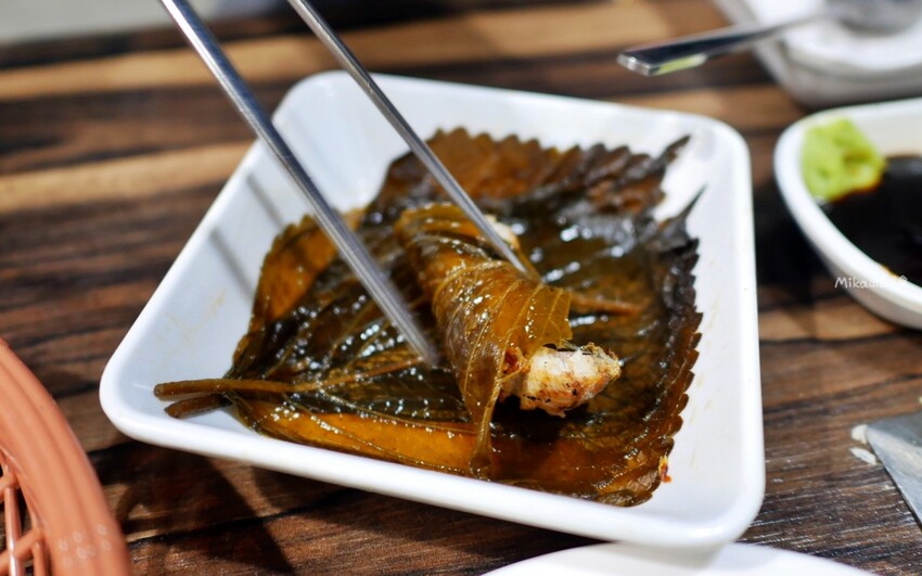 醃芝麻葉有點鹹,但包鰻魚吃剛好。