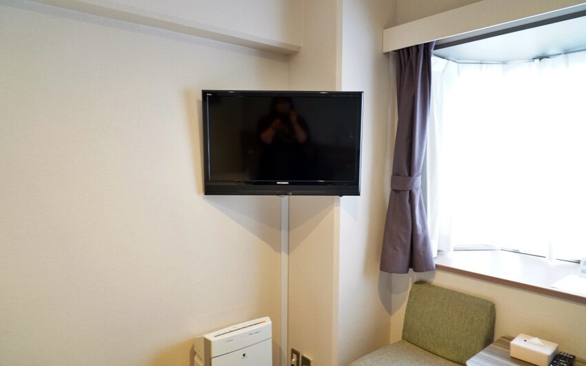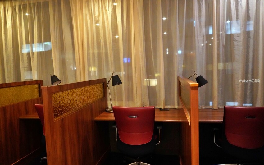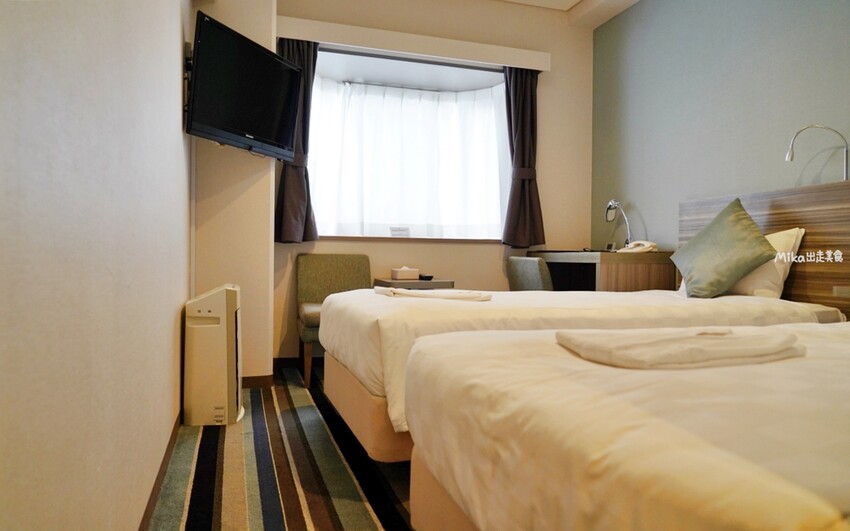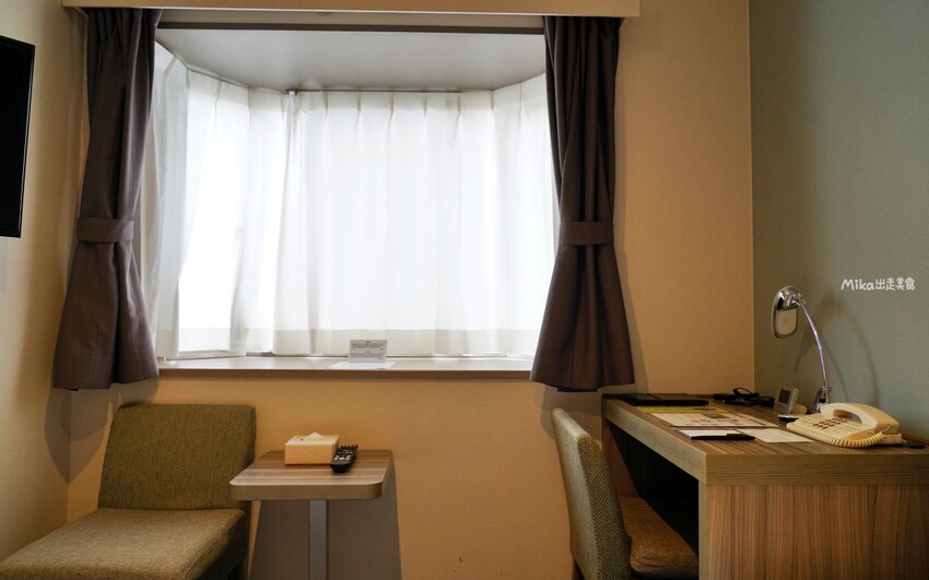 客房看起來是不大,但簡約明亮的裝潢風格延伸出空間感,寬敞的工作桌置於凸窗前,還有冰箱、茶具組等等,房間小巧但能提供舒適的住宿體驗。