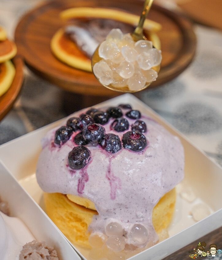 軟綿入口即化,淋上特製濃稠的藍莓優格、撒上新鮮藍莓、寒天啵啵