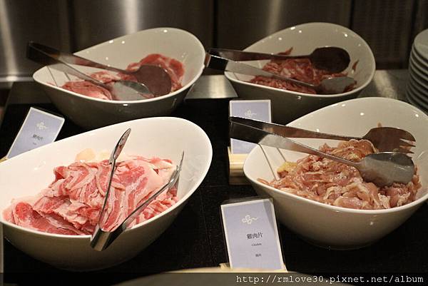 有四種肉類,包括豬 雞 牛 羊都放在漂亮的盆子裡,愛喵說的好:不規則形狀的盤子比較厲害