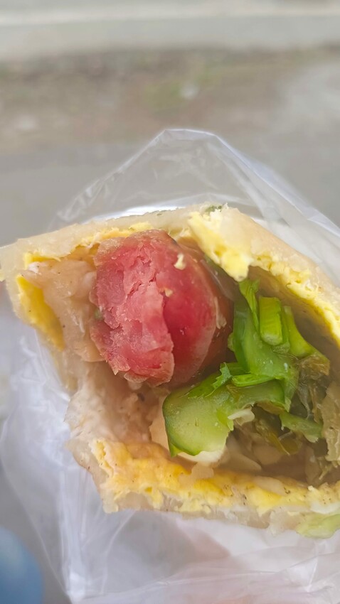 他們的香腸蔥抓餅包的料還挺多的,除了香腸,還有小黃瓜,蛋,洋蔥,蘿蔔絲,蒜粒和香菜,因為是現煎現做,假日人多,我們等了40分鐘才拿到