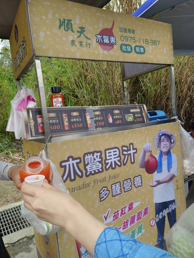 可能二水花旗木鐵道這幾年突然變得很夯,所以攤販一年比一年多,今年鐵道對面的攤販儼然成了一個小市集,來這裡賞花不怕沒東西可吃,我們剛好站在這攤木鱉果的對面,一直聽到他們的廣播,好奇心大起就先過來探探,老闆很大方請路人試喝,乍看之下很像胡蘿蔔汁,滋味酸酸甜甜,比想像中好喝