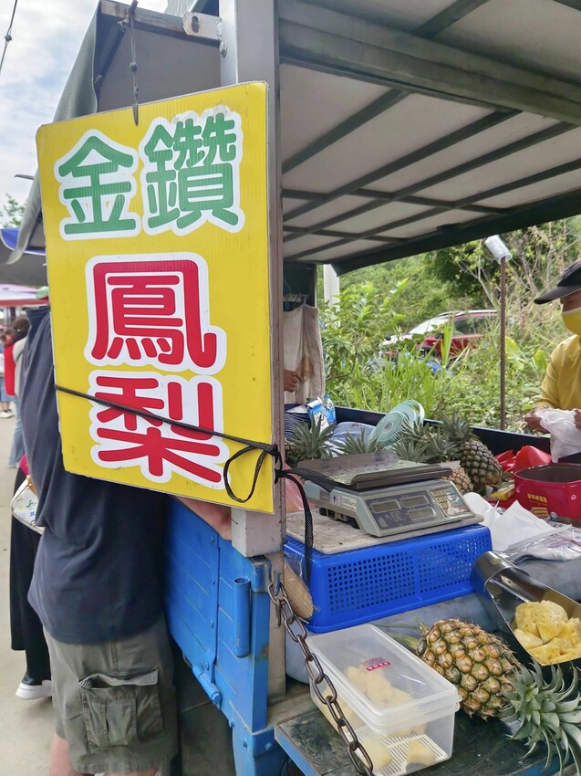想不到攤販市集也有人來賣水果,台灣小農真是越來越厲害了,這攤是金鑽鳳梨,另外還有一攤賣芭樂,我們剛好撿到老闆要收攤了,一大袋有7~8個大芭樂才賣$100,我們就很開心地買了一袋