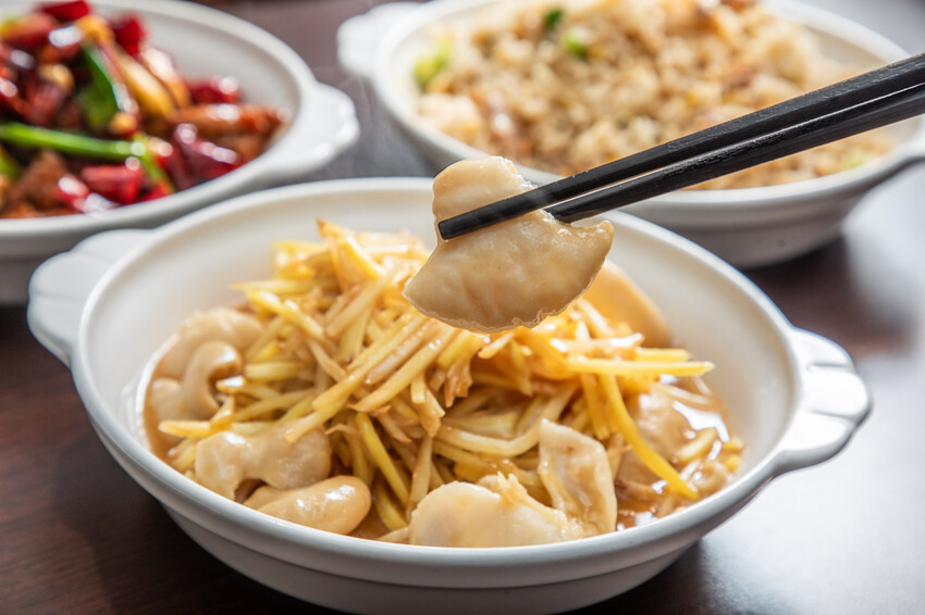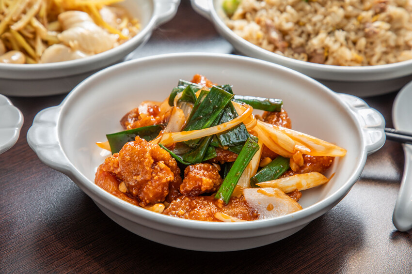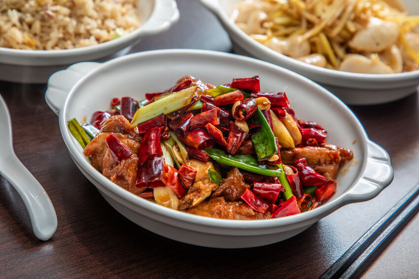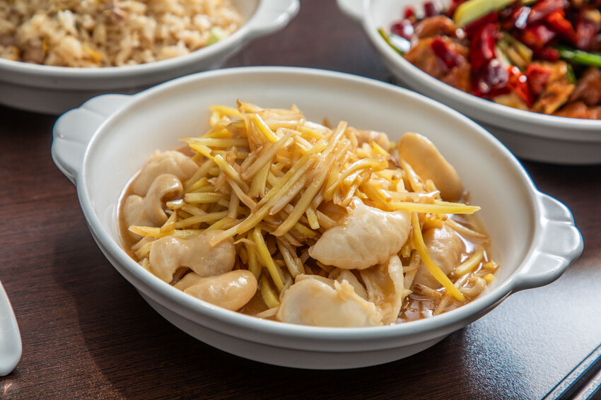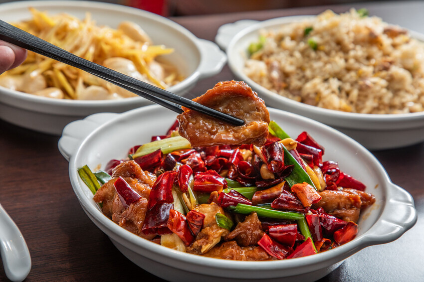 宮保雞丁,這裡是用肉汁充沛充滿彈性的去骨雞腿肉,先炸過讓雞腿外層帶有酥脆感,再與乾辣椒、花生、花椒等辛香料爆炒,辣香氣十足,辣非常有層次感,加上花生米脆脆的口感,口感特別好吃