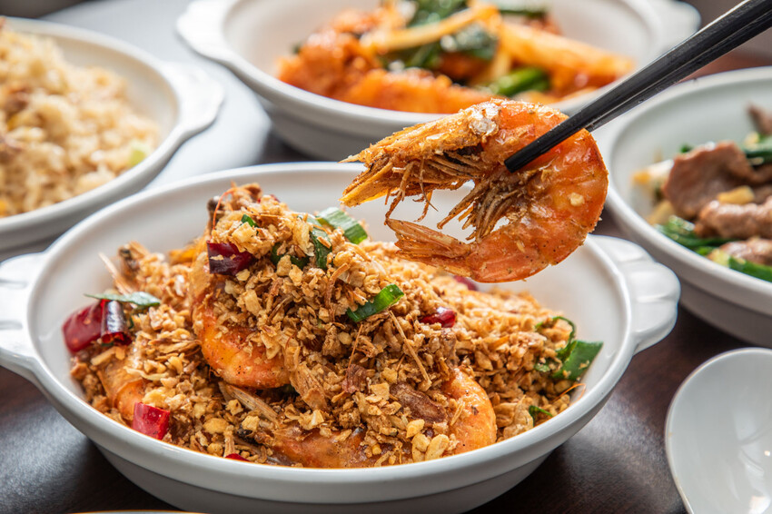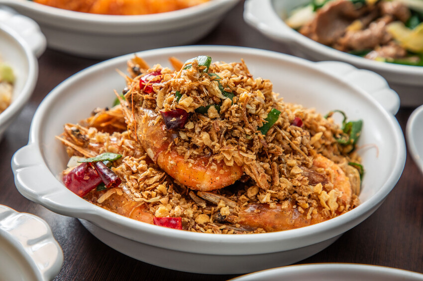 鹹酥蝦,也是用大尺寸的白蝦,大火炸過後加入辛香佐料拌炒,上面灑了胡椒鹽跟滿滿蒜酥,整隻蝦炸的酥酥脆脆,可以連殼整隻吃,佐料直接用來拌飯也很讚
