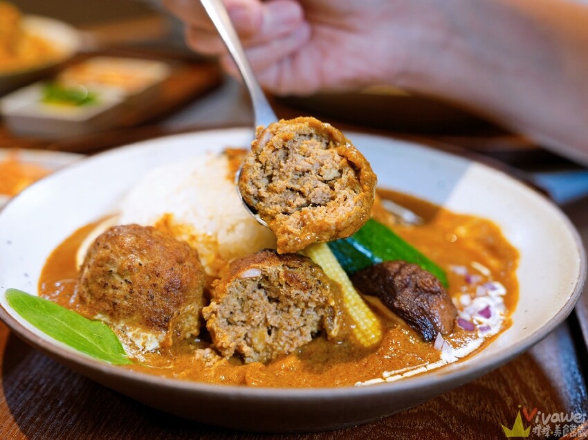 ▲咖哩飯裡面還搭配了玉米筍、櫛瓜、香菇,這醬料給的還蠻多的,大概可以配兩碗飯!而且在茶鳩咖哩內用是可以免費續飯的喔,肯定可以吃飽飽👍