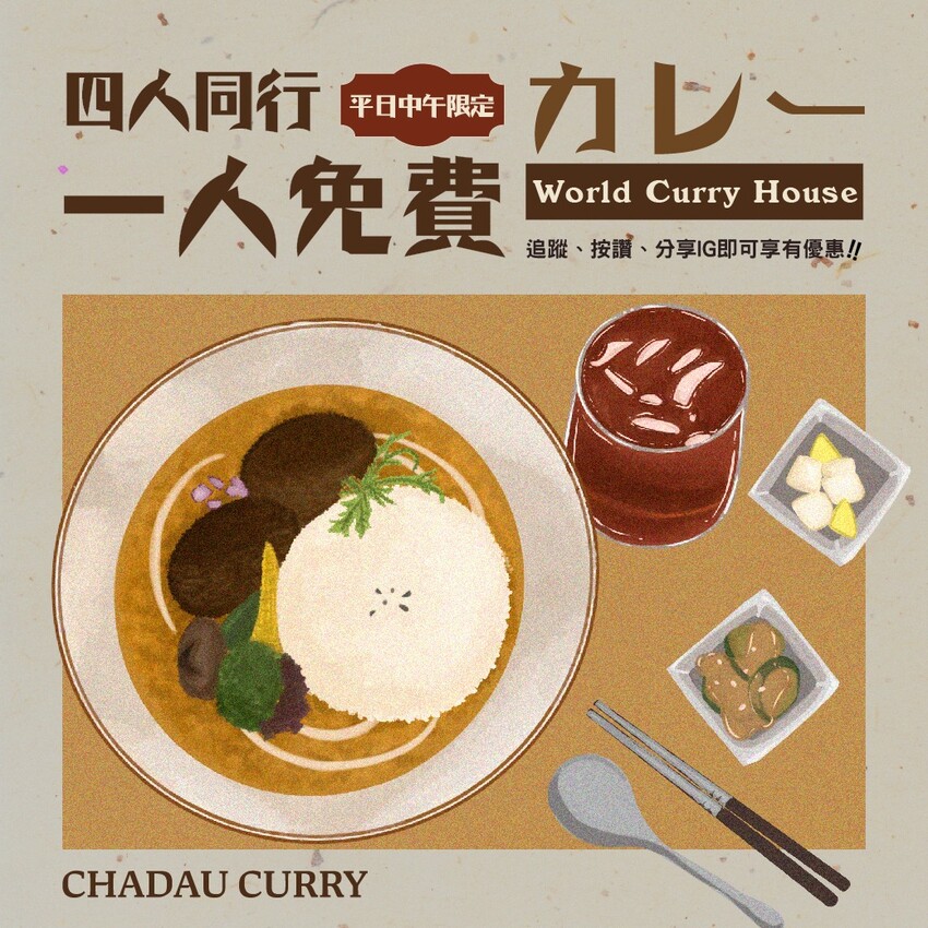 ▲「茶嶋咖哩 Chadau Curry」在平日中午推出了四人同型一人免費的優惠活動(只要追蹤、按讚、分享IG即可享有優惠唷)!