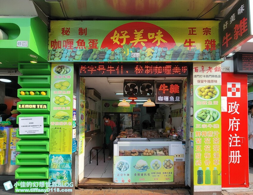 榮記牛雜屹立澳門七十多年,已經承傳第三代歷史,以祖傳秘方製作牛雜,濃郁的咖喱醬汁滲透至每款食材之中。牛雜也是澳門的代表美食之一,官也街上就看到好幾家牛雜店,榮記牛雜在安德魯蛋塔旁邊,排隊人潮也滿多的,店員手腳都超快速,沒兩三下工夫,一碗熱騰騰的牛雜就煮好了。