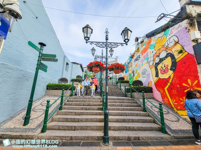 官也街除了吃美食買伴手禮外,還能逛逛二手精品店跟拍些美照,是個能待個一整天的地方。從鉅記手信和咀香園餅家中間那條最繁榮的美食街走到底,過馬路可以看到老虎糖跟爆打檸檬茶,旁邊有一個階梯彩繪牆,走上去之後會感覺來到非常葡式風格的地方,跟剛才人潮擁擠的美食一條街有著很明顯的反差。