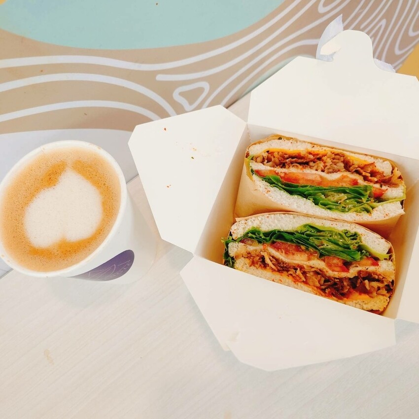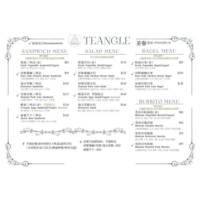 TEANGLE 茶參接受大宗預定與外帶,有選擇性障礙的人就可以參考菜單上標註星星號的餐點,是很多人會點的暢銷商品,像是舒肥雞胸三明治 焙燒里肌三明治 秘製牛牛三明治,飲料我推薦嚴選南島鮮乳及很多飲料店都選用的OATLY燕麥奶,是喜歡喝拿鐵的人必喝的飲料!我選擇加燕麥奶的風味拿鐵(熱/榛果) ,也點了秘製牛牛三明治~~