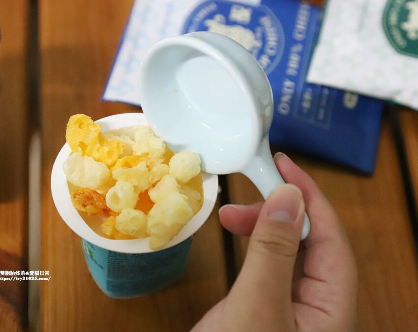 脆脆起司球沾上酸甜的優格,口感上也變得更多層次,當孩子下課後想要解饞,只要一杯優格+一包抱抱奇司脆脆起司球POP CHEESE就搞定,超方便又讚的點子。