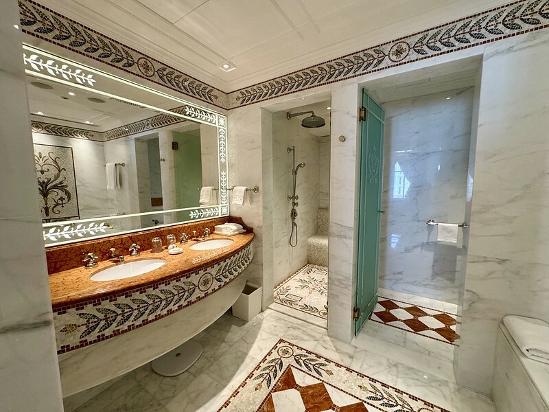 地板和洗手台上的馬賽克拼花更是散發著奢華感,令人心曠神怡。