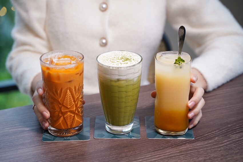 飲料「泰式奶茶」就跟我在泰國喝到的一樣道地好喝,比較有特色的是這杯綠色的「斑蘭奶蓋」,獨特的斑蘭香氣加上鹹甜奶蓋,順口好喝,「菠蘿蘋果」就是酸酸甜甜的鳳梨蘋果汁,老少咸宜的一款飲料。