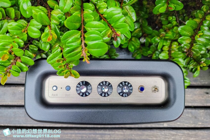 Fender Newport 2的重量只有1.45公斤,尺寸 18.8cm X 寬 7.1cm X 高13.2cm,算是輕巧型便攜式的藍芽喇叭;最上方的設計上有配對(PAIR)、麥克風、雙喇叭(DUO)、音量控制、高音控制、低音控制、指示燈、電源開關,三顆控制旋鈕都各有1-10級可以調整,配合主體也帶有點復古感。旋鈕在使用時也會有一點阻力感,我自己很喜歡這樣的感覺,更有儀式感一些。