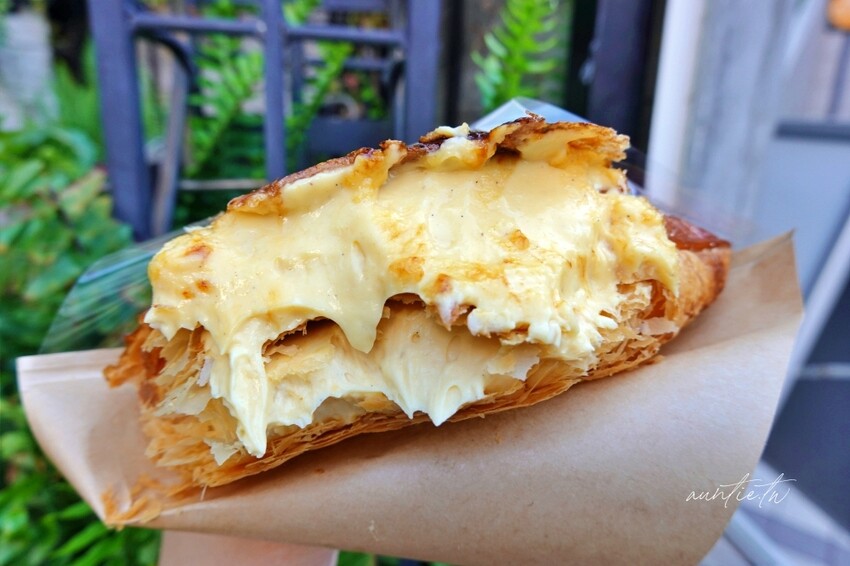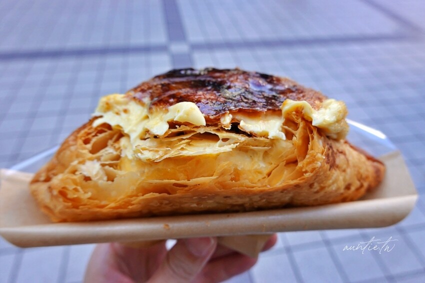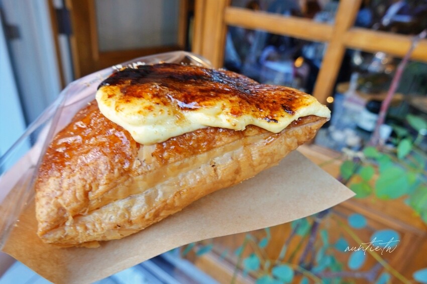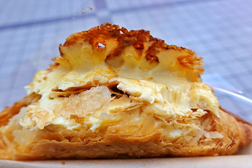 千層酥上還有一層剛剛烤好的焦糖烤布蕾,酥酥脆脆的焦糖口味,香氣非常濃郁,千層酥一口咬下真的是酥脆到不行,一層一層的薄脆程度真的是蠻厲害的,內餡擠入卡士達奶油餡,香濃不膩口,搭配著千層酥一起吃非常美味,除了焦糖烤布蕾甜度稍高外,卡士達奶油跟千層酥不甜不膩,也不會覺得太油膩,但不知不覺就會吃下爆表熱量!