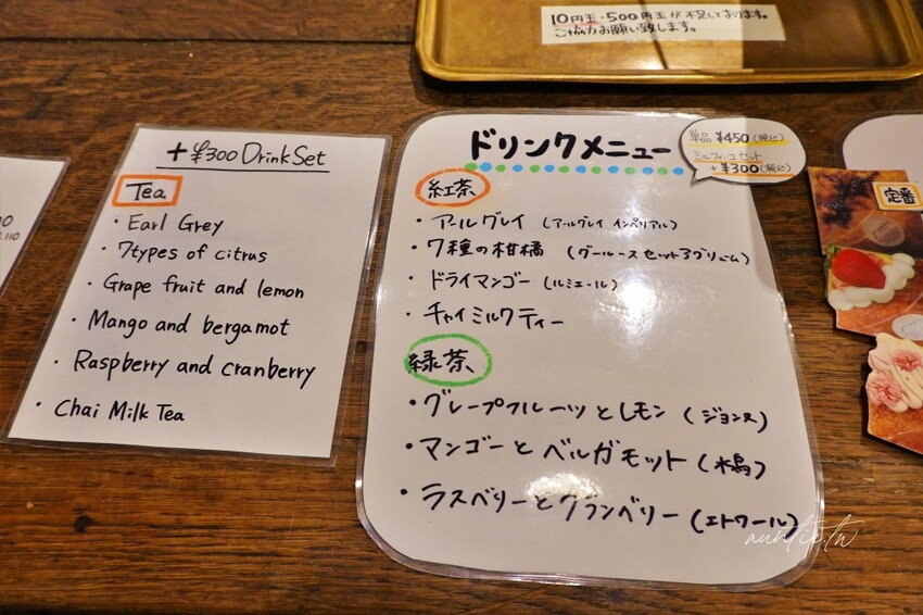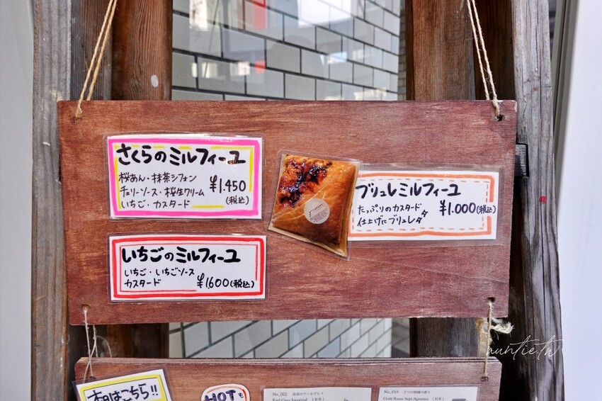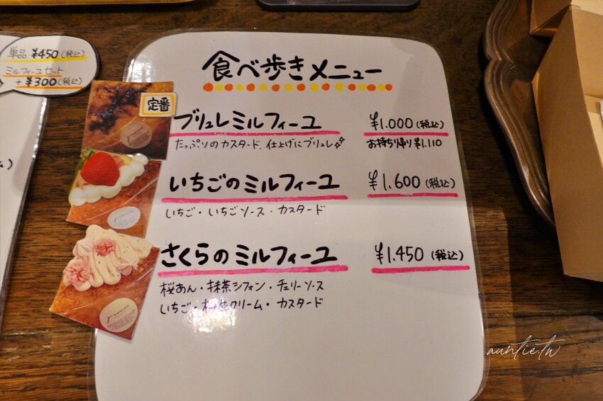 千層酥可以+300日幣,就可以多茶飲變成套餐,目前的千層酥口味有烤布蕾千層酥、草莓千層酥以及櫻花抹茶千層酥,第一次來就點基本的烤布蕾千層酥試試口味。
