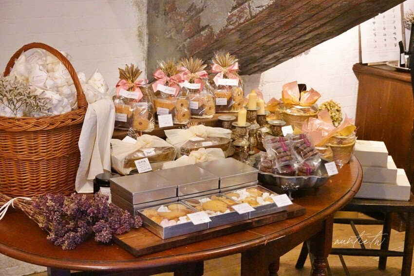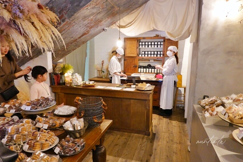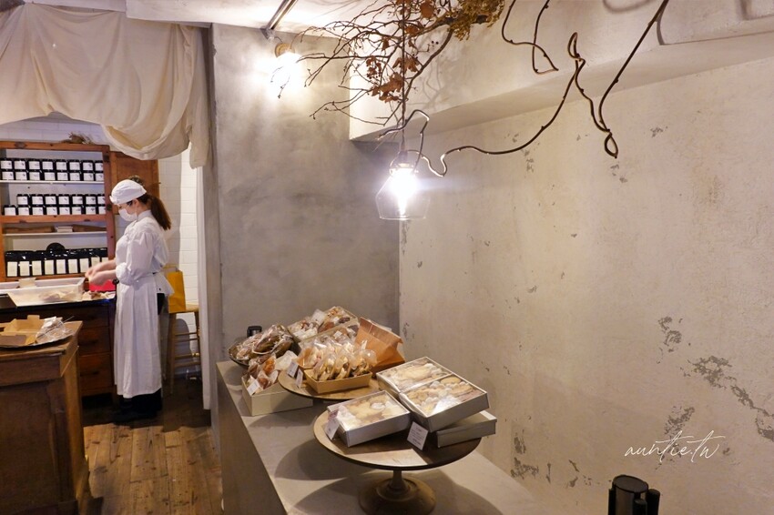 店內的環境佈置很有質感,木質裝潢,架上擺滿了各式餅乾,餅乾的款式蠻可愛的,不過在台灣就有類似的店家在賣了,所以比較沒吸引力,要買千層酥的話直接到櫃台點餐結帳,拿號碼牌後等叫號。