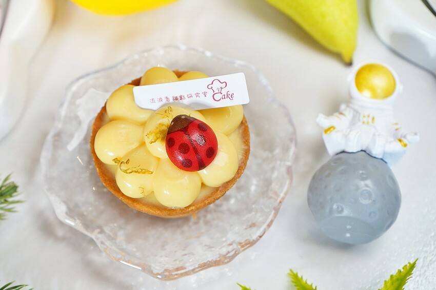 最多長輩必買的「芋見初夏」,本體是三層香草戚風蛋糕,結合了自家熬煮的大甲芋泥、自製布蕾布丁與手工手炒麵茶,表面再以馬卡龍外殼與多種水果點綴,復古又不失新意。