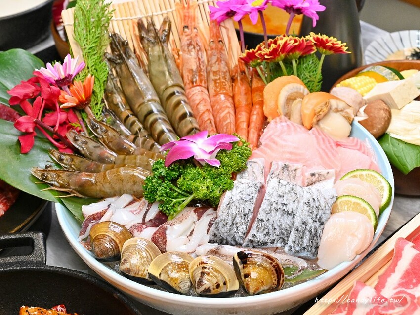 想要海鮮、肉品一次擁有,點熟鍋這道雙人海陸豪華饗宴就對了,瞧瞧這盤海鮮拼盤有多霸氣,光是蝦子就包含草蝦王、天使紅蝦、胭脂蝦、草蝦及白蝦共五種蝦,還有透抽、日本干貝、帆立貝、鯛魚、鱸魚及蛤蜊,每樣海鮮都非常新鮮呢