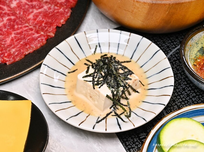 熟鍋鍋物套餐,除了湯鍋、主食、菜盤、雞蛋及副食外,還有提供開胃前菜,開胃前菜是胡麻豆腐,採用嫩豆腐,淋上胡麻醬汁,再搭配海苔絲點綴,胡麻香氣濃厚,搭配綿密嫩豆腐,清爽又開胃