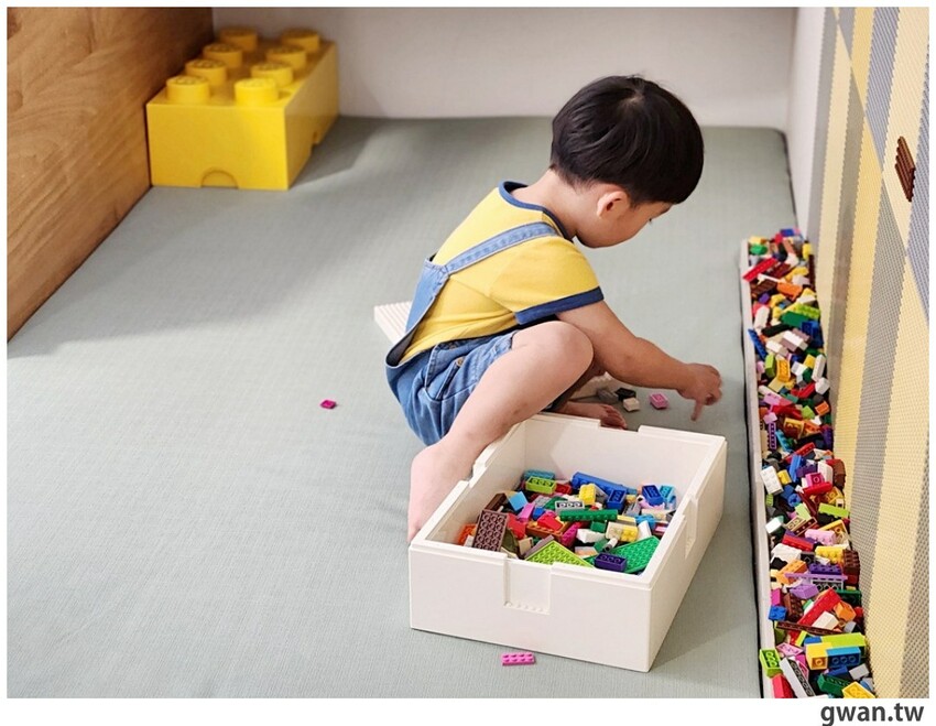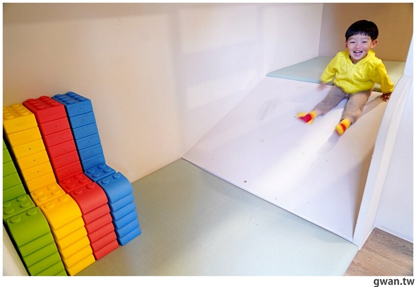 小斜坡可以當成溜滑梯,雖然短短的,但房間裡就能溜滑梯小朋友還是超開心耶,還有大型的樂高軟積木,很適合給小寶寶玩