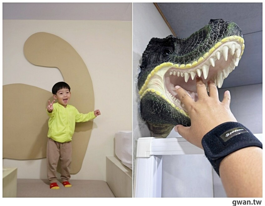 五船民宿還有其他親子房,朋友一家人住到小男生很愛的恐龍房,兩間房型格局都差不多,主要差在房間內佈置,這間到處都有恐龍蹤影,遊戲區則規劃成小小的攀岩空間