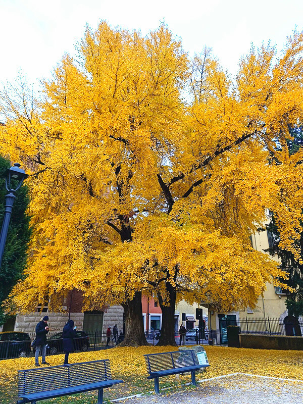 在千年古城維羅納的小巷中穿梭,總會有不期而遇的驚喜,比如說這棵200年的銀杏樹,金黃耀眼的葉子一下子就吸引了大家的注意力