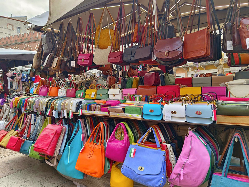 導遊在講我都沒在聽,因為注意力都被廣場上的攤位所吸引,雙眼不由自主地一直往旁邊的彩色包包瞄去,身為一個包包控,不多看幾眼怎說得過去?就跟男人見到美女總是目不轉睛的道理相同,這麼多五彩繽紛的包,馬上就吸引了我的注意力!不過我還是很節制地只看不買,因為聽說佛羅倫斯才是皮革重鎮,所以在維羅納市集先看看就好