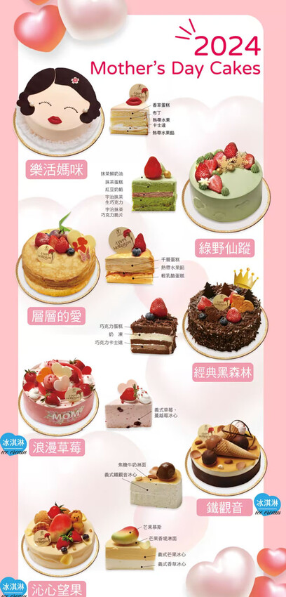 限定母親節蛋糕有七款蛋糕口味、三款冰淇淋口味
