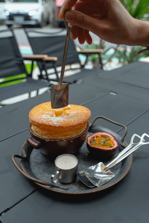 ▲剛送上桌滿滿的蛋香,老闆說這個舒芙蕾裡面完全沒有澱粉,只有蛋白在裡面,烤到澎澎的高度看起來好療癒。